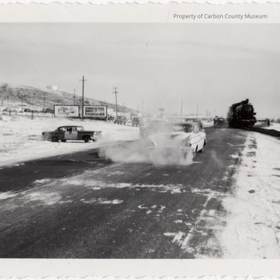 B/W photograph of several cars and a train engine. Most of the ground is covered with snow. The edges of the photo are scalloped.
