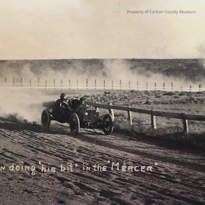 A 9" x 13" (photo only) black and white photo of a dirt race track with an inner and outer fence around it. A man with a passenger is in an open top vintage racecar and is driving on the inside lane of track. It appears to be going fast enough to leave a large dust trail behind. Both men are wearing caps and goggles. White print from the developing process on front of print reads, "Cliff Sundin doing "his bit" in the "Mercer." "Rogner Photo."Collection