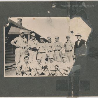 Black & white print. Snapshot. Mounted on grey matboard. Image of 11 men - ten dressed in uniforms - posed in front of a wooden building with a porch. Uniforms have "FTS" on left side of shirt. All men are wearing caps, most have gloves and/or baseball bats. Man at far right is wearing a dark suit, white shirt, dark bow tie, & light hat.