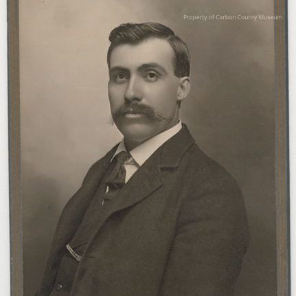 Update 2008: Black and white print. Studio portrait. Cabinet card. Mounted on grey matboard with black edge and gold highlights. Head and shoulders image of a man dressed in a dark suit with vest, white shirt and dark tie. He is turned 3/4 to his right but is looking at the camera. He has short hair, sports a mustache. Watch chain can be seen on vest.