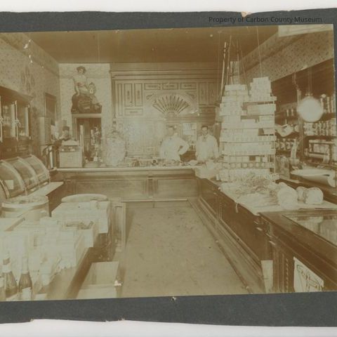 Update - 2009: Sepia print mounted on a black mat. Image of interior of a store with four men behind a counter in the back. Man on far left is standing behind the cash register & wears a dark coat & hat. Other three men have on white jackets or smock shirts. Walls are papered except for back wall & it has ornate panels with fan pattern in the middle above glass front cabinet doors. A large advertisement poster is on photo left of a lady sitting on a barrel reading: "J H Heinz CO. FOOD PRODUCTS" "Pure pickling vinegar Heinz" She holds a bag reading: "Swifts Premium Ham Bacon". "One of the 57". Left are bottles of Ketchup, boxes of soap, a box which reads: "Talisman Codfish Cakes", two barrels & bins with glass covers. Above are more glass front cabinets with bottles in them. On photo right is a counter with display of crackers & other boxed items stacked on shelves. Counters & shelves are filled with other grocery items. A sign on front of counter reads: "oysters seal shipt". One item on shelf reads: "ZuZu".