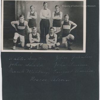 Black & white print. Studio pose. Full-length portrait of the Rawlins High School basketball team and coach. Group posed in front of a painted scenery backdrop. Team members are wearing uniforms. Man at center is dressed in dark pants, white shirt and dark bow tie. Basketball at center front painted with " 1912 RHS".