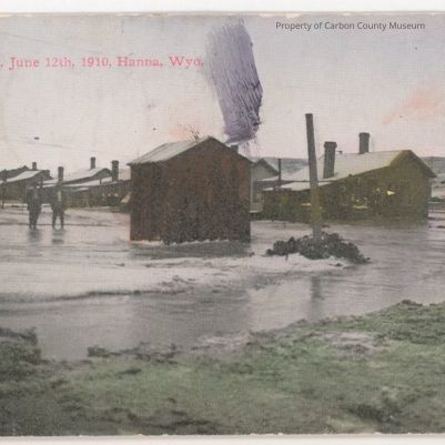 On the front in the left hand upper corner in red print "Cloud Burst, June 12th 1910, Hanna, Wyo" off to far right in red "4779" top center black smudge of ink. Picture of small houses all in a row. Rows of poles possibly telegraph lines. Water is standing and looks like it is moving in some places. Two men are standing toward middle of the picture standing in water that looks like it could be to their boot tops or middle of their calves.