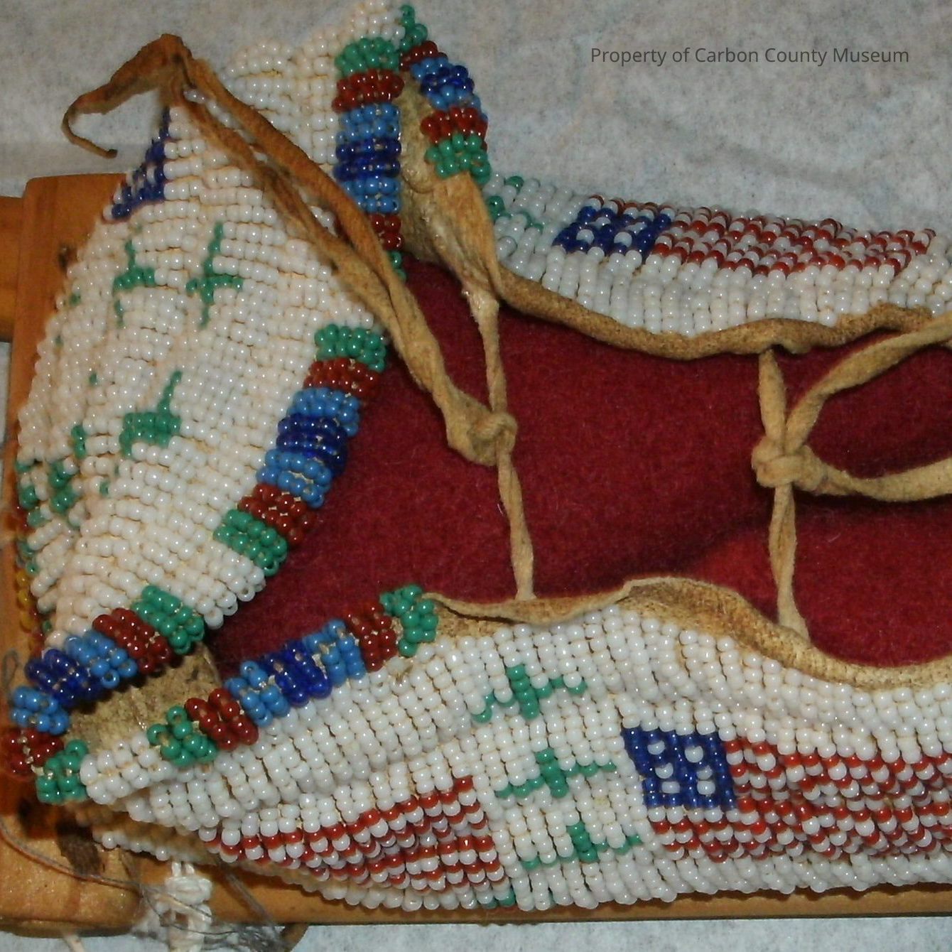 A toy Native American, tribe unknown, cradleboard, beaded in small United States six flag design encircling the cradle edges. white and green beads are accent colors. Red trade cloth covering inside the cradle. Balsa type wood support the cradle and pieces are held together with small leather strips laced through the pieces. The beaded leather is held together with strands of latigo.11" long end to end, and 3 1/4" at widest point. Donor states that the object is old and that the board may be newer.Collection