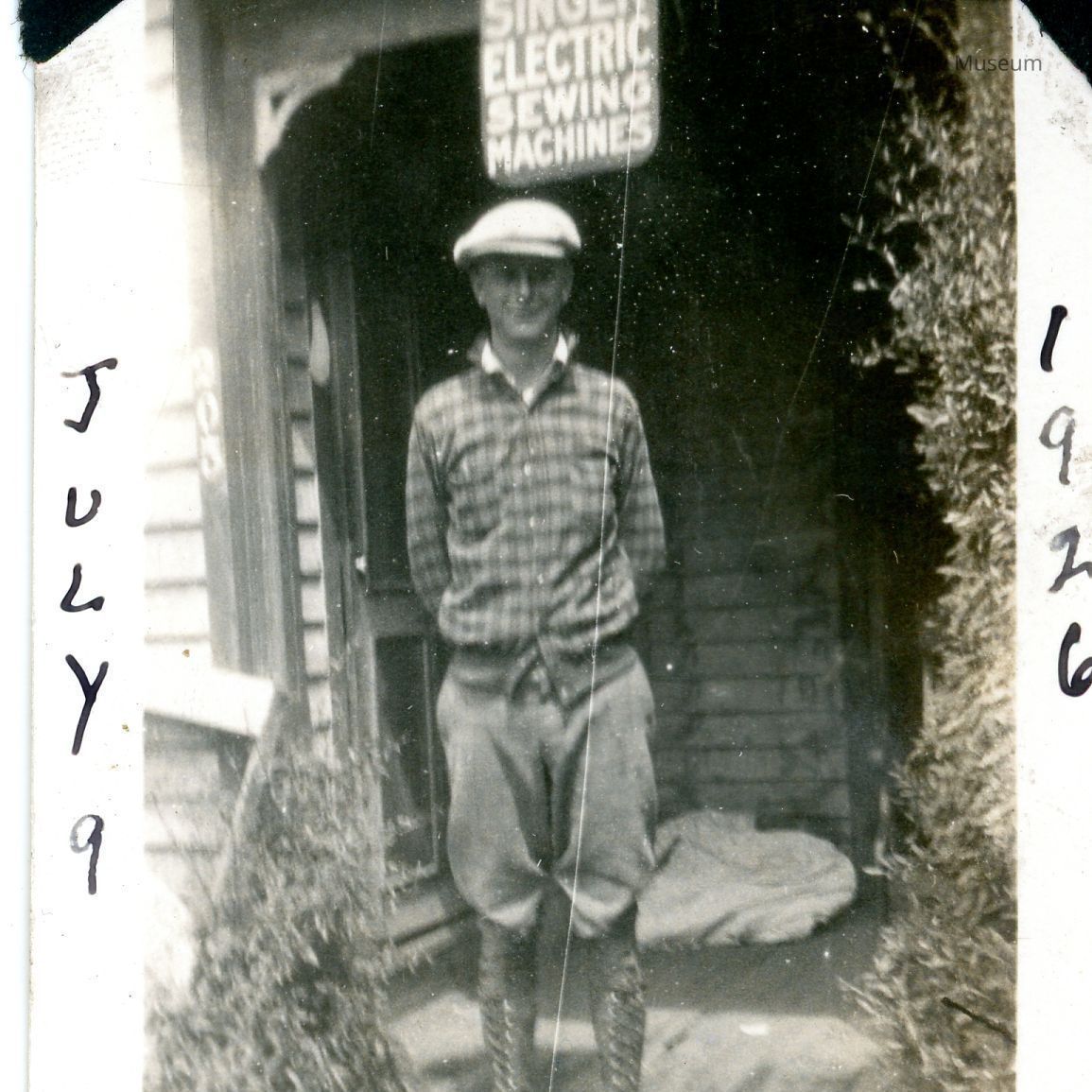 Small black and white photograph. A man is standing in front of a porch, the sign above his head reads "SINGER ELECTRONIC SEWING MACHINES". Written along the tope edge of the photograph is "RAWLINS", along the bottom edge "PAUL GILMAN", vertically along the left edge "JULY 9", vertically along the right edge "1926". On the reverse is a circular green stamp that reads "MEYERS PHOTOS PHOTO FINISHING RAWLINS, WYO".Collection