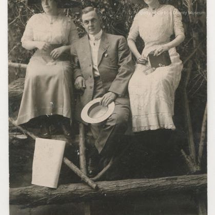 Update 2/2010: Black and white unused postcard print. Image shows a studio portrait of a man sitting on a log fence with a woman on either side of him. the women are all wearing long skirts, longsleeve blouses with high neckline. They have very wide brimmed hats. Foliage and scenery is in the background with a log railing running horizontal along the bottom edge. A white square object is at side left.