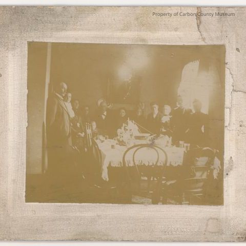 Update 2/2010: A faded black and white print attached to ivory matboard which has a textured outer border . Image shows a group of men, women and a child standing around the sides and rear of a dining room table which is set with linens and dishes. An unknown object is at table center with strings emanating at an angle (ship).