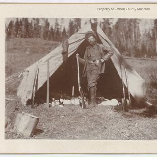 Update 2009: Sepia print. Snapshot mounted on patterned off-white matboard with gilt edges. Image of a man standing in front of a canvas tent and holding a rifle by the barrel. man is dressed in dark shirt, pants, boots and jacket and is wearing a hat; he has a holstered pistol on his belt. Three other rifles-two at right and one at left are leaning against tent. Scabbard is draped over tent top. Candle and bottles can be seen inside tent opening. Metal bucket in left foreground. Trees in background. Saddle and saddlebag on ground at right.
