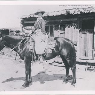 Black & white print on grey mat of a woman on horseback. Horse is standing in front of a log structure. Woman is wearing a striped long sleeve shirt with neck scarf, hat, gloves, split skirt & lace up shoes. She has on a cartridge belt with a pistol tucked beneath it. Her horse is dark & saddled with several folds of saddle blanket. Another log structure is in photo left background.