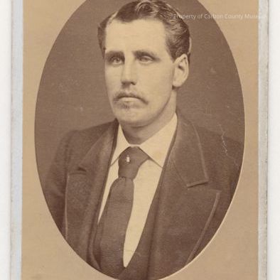 Update 2/2010: Black and white studio portrait attached to white matboard. Image is an oval with a tan outer rectangle. Image shows a dark haired man wearing a dark suit jacket, vest, broad tie with tied tack and white shirt. His hair is slightly graying and he has a small light colored mustache and small goatee.