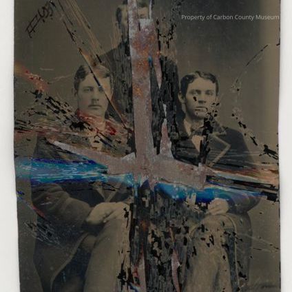 Metal badly bent both horizontally & vertically through center - emulsion missing through center & metal rusting. Surface missing to black underpainting over much of surface - features of standing man obscured.Collection