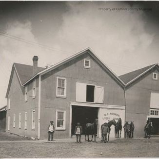Black & white print on grey mat. Image of a large, wood, two story livery stable. Lower level photo center has a large sliding door that is open, another double door left, opening is above & photo right door is open. Building has three peaked roofs with a small window in two eaves on front. Lower level on photo right has a large open door with a paned window immediately above it & a loft door above that which is closed. Side of building has rectangular windows on both levels. Next to livery is a brick two story building. Behind livery is a dark wood structure. Standing in front are four men, one holding reins of two horses & one holding reins of two more horses. Then a man on horseback in front of open door on photo right. A boardwalk way in front of livery and toward photo left. Painted on large sliding door: "D. D. Richmond Livery Stable"