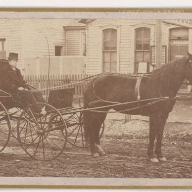 Photo of a man in a carriage in front of F. J. Weber and Brothers Photography Shop, Erie, Pennsylvania.