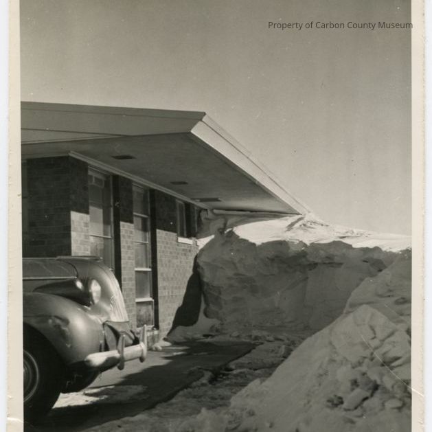 p-q) A large, high pile of snow in front of a building whose eaves and roofline are showing. Three dormant tall trees are behind the structure. Written on back of q: "Ideal Motel-where we stayed the first time we came to Rawlins."