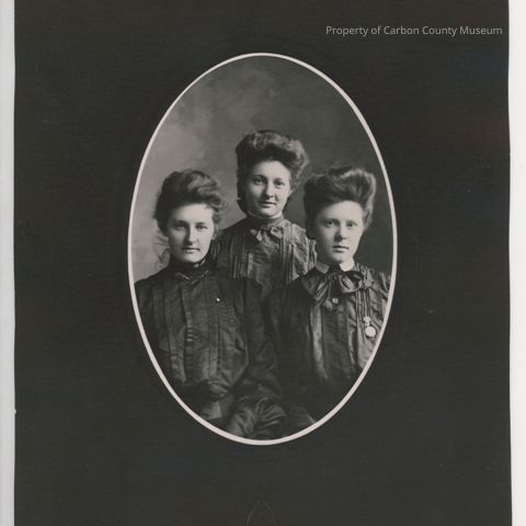 Update March 2011: Black & white copy print studio portrait of three young women in dark dresses. Their hair is in an updo with large bows at the back of their heads. Woman on right has a flower brooch in center & a watch attached to her left chest. Woman on left has a small pin attached to her left chest. Written on top left: "The Ferris Studio" On bottom center is tee pee & "Rawlins, Wyo"
