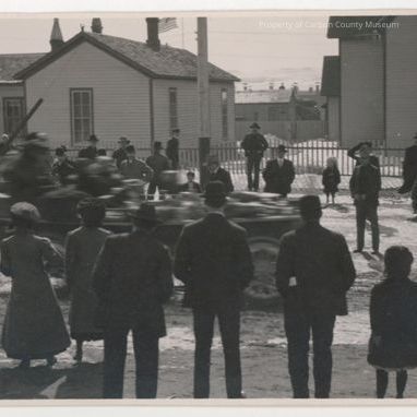 A crowd of people watching a car in motion at a Parade near the Catholic Church, Rawlins.
