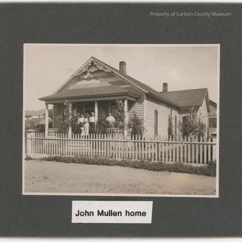 Update March 2011: Black & white print on black mat. Image of a clapboard house with small, covered open porch. Porch roof is supported by four columns & bottom has low spindle railing. Gingerbread trim is at eave of house with scalloped trim above porch. Two roofs are perpendicular to each other, each having a brick chimney. House is surrounded by a picket fence. On the porch are four women & a child standing at steps & one behind railing. Printed on a white paper attached to bottom: "John Mullen Home"