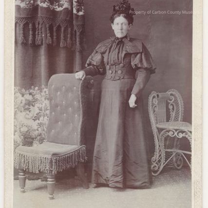 Update 2009: Black and white studio portrait of standing lady. She is wearing a dark ornate dress. It has a tie bow at neck, large square collar folding out toward leg o'mutton sleeves. Front below tie is scalloped above a fitted waist with six large decorative buttons. Long flowing skirt to floor. She has dark hair pulled up and tied with large ribbon. Her right hand is on the back of an armless chair. The chair looks like large wale corduroy, it has button on the back and braided fringe having from the seat, chair has wood legs. To her left in background is an ornate wicker table. There is a dark heavy curtain in photo left background. It has leaf design in a lighter color at top and bottom. There are large braided tassels on curtain. Print mounted on cram colored mat.