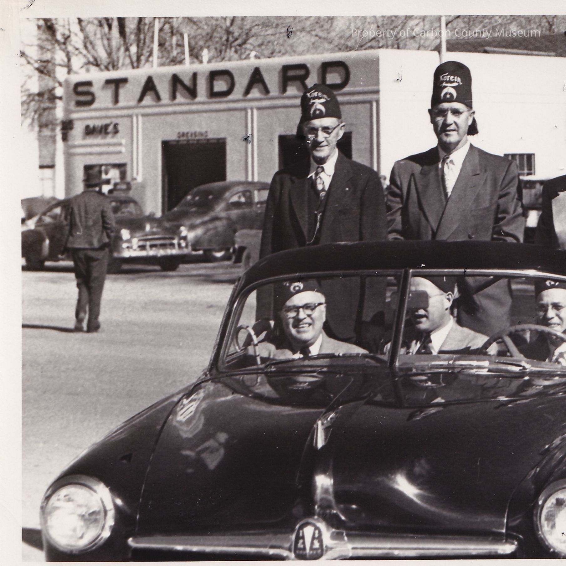 a. 3" x 4," an open black convertible with three men sitting in front seat and three men sitting on the top of the back seat. They all are wearing their Korein Temple hats. Dave's Standard station is in the background.