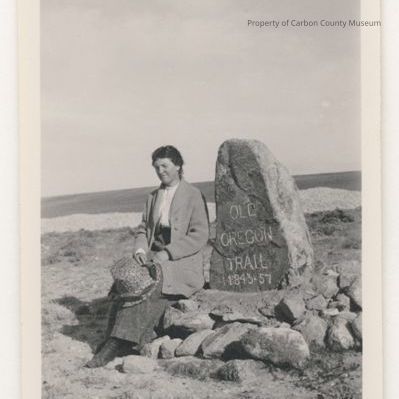 Update - March 2010: Black & white print of lady sitting in front of a rock. It is standing on it's edge & engraved on the rock is: "Old Oregon Trail 1843-57". Rocks are stacked around the marker. Lady is holding her hat in her lap & is wearing a dark, long skirt &white blouse with long sweater.