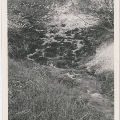Black & white print. Snapshot. Image of a rocky stream bordered with grass & bushes.
