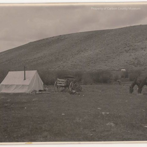 Update 2009: Black and white print. Mounted on tan matboard. Image of a tent camp in a flat meadow with bushes and sagebrush covered hill in background. Wagon in front of white rectangular tent. Stove pipe sticking out of roof. Two dark horses feeding at center right. White horse in background. Man and dog at midground.