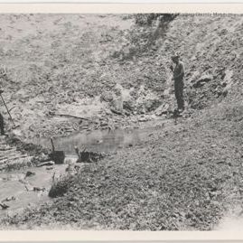 Black & white print. Snapshot. Image of two workmen at a seep at the foot of a dirt hill. Man on left has a long-handled shovel. Water control gate at center. Barren ground on either side.