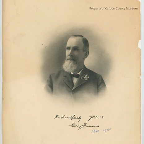 Written on the back in black ink: "Came to Wyoming with Custer's 7th Michigan Cavalry. Came to Rawlins permanently in 1868. Had a contract to kill wild game for the meat supply of the construction workers on the UP Railroad. Owned a 3/4 interest in Ferris-Haggerty Mines. Rancher and sheepman. He was killed in 1900 when his team of horses ran away with him." "Copied" "People".
