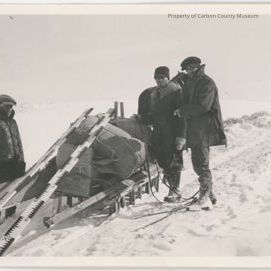 Black & white print. Snapshot. Image of three men with a horse drawn sled of equipment. Two black & white measuring sticks lying on back end of packed sled. Snow on ground all around.