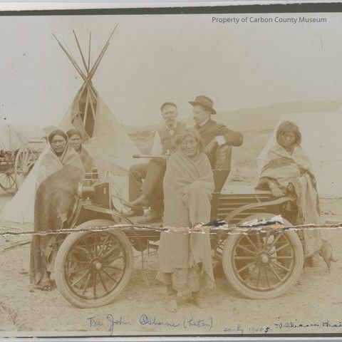 Update 2009: Sepia print. Snapshot. Mounted on dark grey matboard. Image of two men in a vintage automobile and four indians wrapped in blankets. Tipi, tent and wagon in background. Indians have gathered around automobile and individual at right is leaning on the back of the automobile. Back end of a dog can be seen at his feet. Man in drivers seat is dressed in full suit, hat and gloves. Second man is in shirt sleeves, vest, dark pants, polka-dot tie and cap.