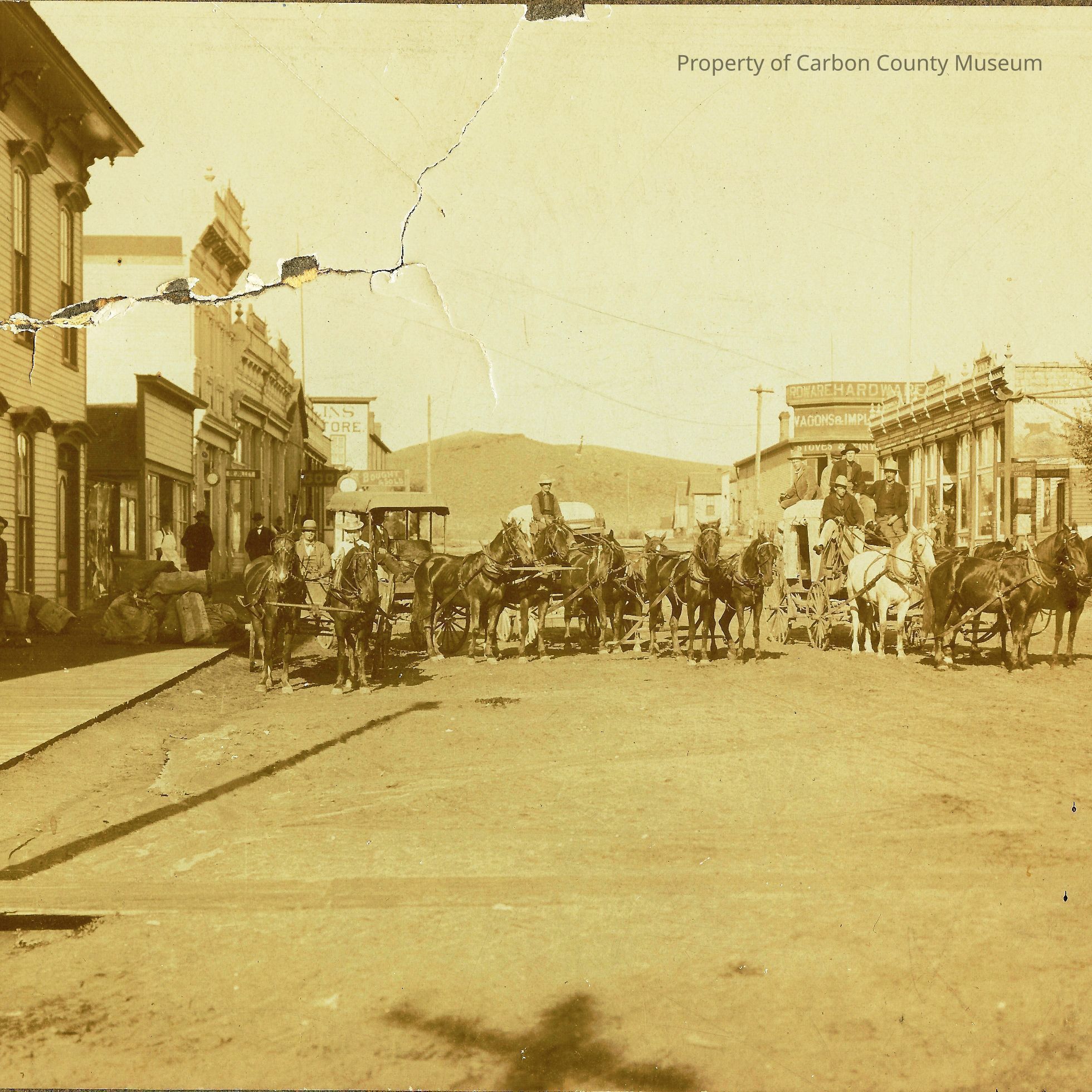 Update - 2009: Sepia print mounted on a grey mat. Image of 400 Block of Cedar St. Parked on the street are two buggies, a stage & covered wagon, all pulled by horses. On photo left are signs: "POST OFFICE" "Dr. Jolley" "Goods Bought and Sold" "Rawlins Drug Store". Across the street a hardware store with sign: "Wagons and Implements" "Stoves". In photo foreground is a boardwalk that goes across the street. On boardwalk on photo left several people are standing & sacks are piled on walk. A man & woman sit in buggy beside sacks, behind them is another buggy with canopy, to right is wagon with driver & then a stage with five men riding on top & the door is open.