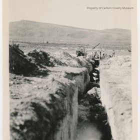 Black & white print. Snapshot. Image of a deep trench cut into the prairie. Workmen & truck at far end. Rough bottom on trench; piles of dirt on left side. Hills in background.
