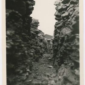 Black & white print. Snapshot. Image looking down a rocky trench from inside. Tent-like structure at far end.