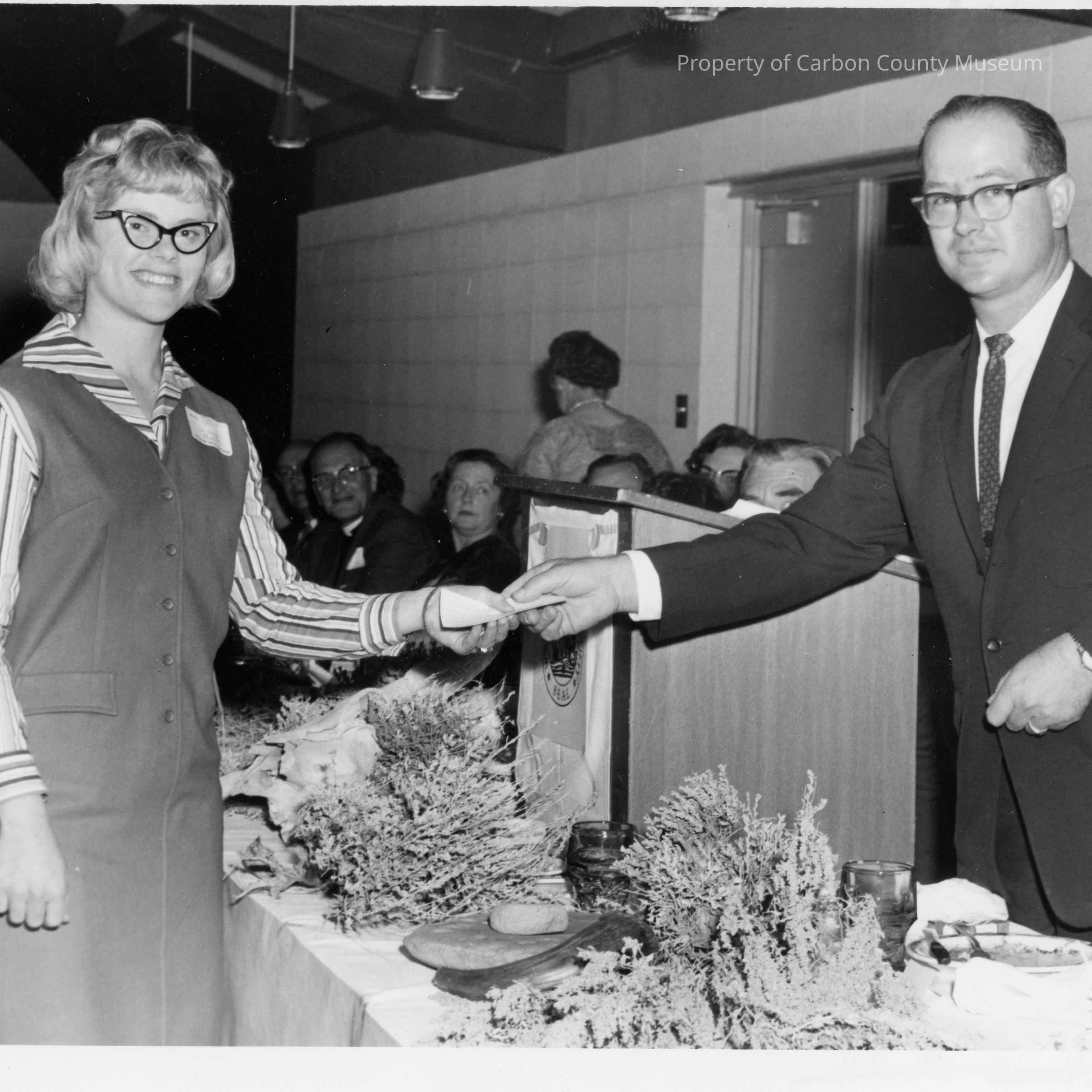 A 5" x 6.25" black and white photograph of a young lady receiving a piece of paper from an older man, dressed in a suit. The man is leaning across a decorated banquet table. Other people are seen in the background. Written on the photo back: "Terry Burgess receiving prize from the state president of the Wyoming Historical Society, Neal Miller, at the State Historical Society Banquet at Rawlins, Sept. 12-13, in Jeffrey Center. " "Daily Times." Stamped in blank print Professional Photo Services Sep 14, '64, Frank J. Meyers, Rawlins, Wyo.Collection