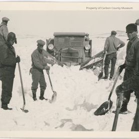 Black & white print. Snapshot. Image of a group of six men with shovels working to clear away deep snow. Vintage snowplow stopped at center behind men. Hills in background.