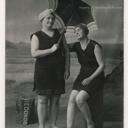 Sister and Myself. Two ladies in dark long old fashioned bathing suits with umbrella posing in from of a mural of ocean and Past Redondo.