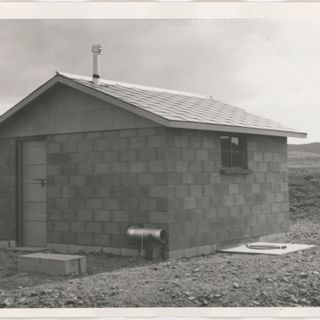 Black & white print. Snapshot. Image of a small cinderblock building with locked wooden door & small window. Large pipe coming out of lower right of front wall. Small wood box in ground in front of building; circular hatch in concrete pad at center right wall of building. Vent pipe on roof.