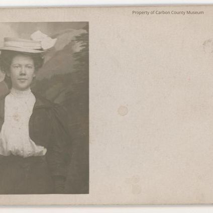 Update - 2009: Black & white print. Printed on postcard paper. Studio Portrait. 1/2 length image of a young woman in dark skirt & jacket, white lacy blouse & flat crown hat with a white bow. Painted backdrop behind. Photo on left side of postcard front.