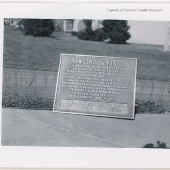 Five black & white prints. Snapshot. Image of the commemorative metal plaque before mounting. Plaque leaning against curved wire edging. Lawn & house in background. Sidewalk in foreground.