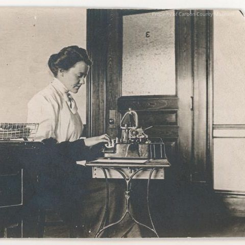 Update March 2011: Black & white print of a lady sitting at a typewriter table with her fingers at the typewriter keys. An office desk is on photo left & a door with opaque window is behind her with a "3" on window.
