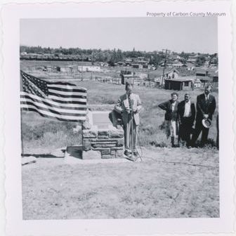 Black & white print. Snapshot. Image of a man giving a speech beside a stone & concrete monument; American flat at left. Three people at right. Buildings, trees & trains in background. Scalloped edges.