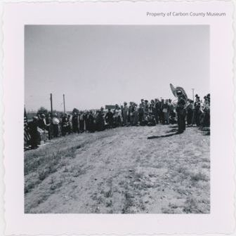 Three black & white prints. Snapshots. Image of a band & large group of spectators standing around & in front of a stone & concrete monument. Scalloped edges.