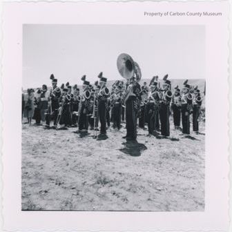 Black & white print. Snapshot. Image of a band standing in a dirt field. Spectators at left. Scalloped edges.