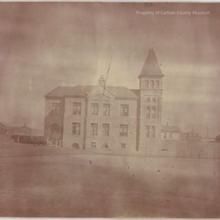 Sepia print. Snapshot. Mounted on a tan matboard. Image of a multi-story stone building with a square tower at right corner. Other buildings in background. Open yard around & in front of building with poles sticking up around the yard. Printing anomaly operating a light & dark wash over surface.