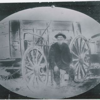 Black & white copy print. Snapshot. Oval. Image of a bearded man sitting on a crate beside a box wagon between the wheels. Man is dressed in dark suit & hat. He is sitting with his hands on his knees.
