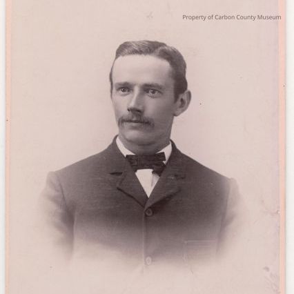 Update - March 2010: Black & white studio portrait print attached to light pink colored matboard. Mat has a decorative rectangle gold banner on lower edge with Baker & Johnson, Evanston & Rock Springs, Wyo printed at lower edge. Image shows a dark haired man wearing a dark jacket, white shirt & dark bow tie. He has a dark mustache. A white shadowy effect surrounds the man in background.