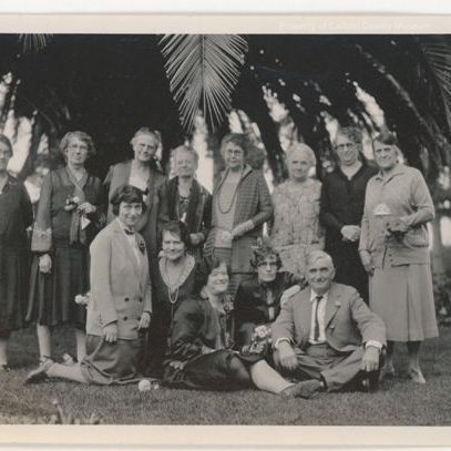 Update 2009: Black and white print. Snapshot. Image of 13 people (12 women and 1 man) posed under palm trees. All women are on grass wearing dresses; man is in a light colored suit, white shirt and dark tie. 8 of the women are standing, 2 are kneeling at left; 2 seated at center; man is seated at right.