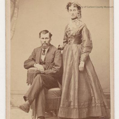 Update 2009: Sepia print . Studio portrait mounted on tan matboard. Full length portrait of a man and woman posed in front of a painted backdrop. Man is seated in an upholstered chair with long fringe; he is wearing a dark three piece suit, white shirt, and short dark tie. he has a mustache and chin whiskers. His left leg is crossed over right and left arm on arm of chair. Woman is standing with her right hand on the man's shoulder; she is wearing dark long sleeved dress with fancy bodice and lace collar; her hair is curled in small tight ringlets; there is a small hat on her head. Patterned floor covering underfoot.