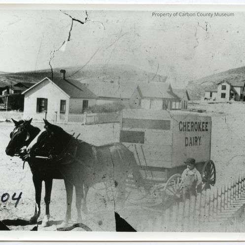 Image of an enclosed dairy wagon pulled by two-horse team. Painted on the side of the wagon: "Cherokee Dairy". Ther is a small boy standing near right front wheel of wagon and a man in checkered shirt standing at far left in front of horses. Fence along right. Written on photo in black marker: "#104".