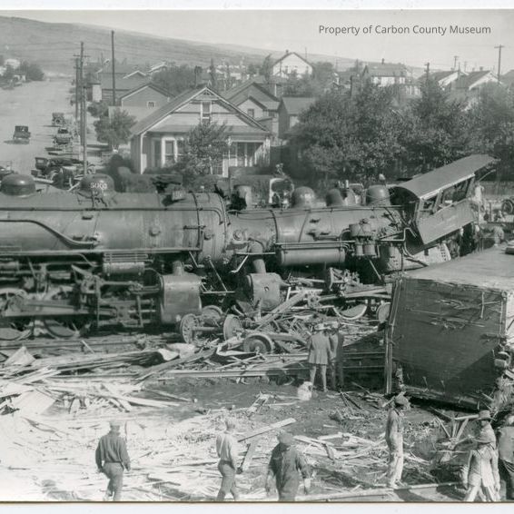2 images of a train wreck. Matches other photos of 09/12/1923 wreck in Rawlins railyard. Runaway Union Pacific locomotive #5003 was stopped by placing locomotive #4464 on the track to collide. Both photos have "#289" written in black marker in bottom left corner. Most likely taken by Frank Meyers.